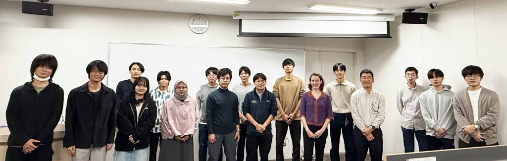 写真集 2025年度 Lescot先生からフランスのフローのグループのコースターを頂きました。Never stop the flow! かっこいいです! 2025年10月28日Collège de FranceのCamille Lescot先生にご講演いただき、講演後に写真を撮影させていただきました! 魚釣りの後に、近くの「魚太郎」でBBQを楽しみました!景色も料理も最高でした!! 2025年9月26日研究室旅行で知多半島の釣り堀に行って魚釣りを楽しみました!参加者全員が魚を釣れました!!お魚との写真 2025年9月22日Cardiff UniversityのThomas Wirth先生にご講演いただき、講演後に研究室メンバーと写真を撮影させていただきました! 2025年5月27日東京科学大学の中村浩之先生にご講演いただき、講演後に研究室メンバーと写真を撮影させていただきました! 2025年4月3日、スライダーに載せたのとは別の全体写真です。 2025年4月3日、お花見を開催!今年は晴天に恵まれました!! 2024年度 2025年3月3日、毎年恒例の追い出しコンパを開催!特注のケーキ登場!! このあと、美味しくいただきました!! 讃岐うどんも登場!美味しかったです! サーモンを超えたサーモン、絹姫サーモンです!!美味しかったです!! 2024年12月21日、今年はコーヒーメーカーを誕生日祝に頂きました!どうもありがとうございます!HAPPY BIRTHDAYのBを除くアミノ酸一文字表記頂きました! 2024年10月23日University of Rouen NormandieのLaëtitia Chausset-Boissarie先生にご講演いただき、講演後に研究室メンバーと写真を撮影させていただきました!この後、懇親会をしました。美味しいお好み焼き、焼きそばを作ってくれた皆さま、どうもありがとうございました! 2024年9月25日Hong Kong Baptist UniversityのJun Wang先生にご講演いただき、講演後に研究室メンバーと写真を撮影させていただきました! こちらは懇親会の写真です。買い出しをして、美味しい焼きそばを作ってくれたM1の皆様ありがとうございました! 2024年7月31日中国の吉林大学の学生さんたちがプロセス化学分野を訪問しました!研究室の学生さんも頑張って英語で研究の紹介をしました! 2024年7月12日研究室旅行でキリンビール名古屋工場の見学に行ってきました!できたてビール美味しかったです!全体写真その1 全体写真その2。企画いただいた学生さんありがとうございました!楽しかったです! 2024年7月10日創薬科学研究科の設立にご尽力賜った福山透先生のご寄付により創設されたTohru Fukuyama Lectureship (TFL)の第4回講演者として伊藤先生にお越しいただき、ご講演後に創薬科学研究科の有機系教員との写真を撮影させていただきました。 2024年6月11日椴山先生にご講演いただき、講演会後に研究室メンバーとの写真を撮影させていただきました。 研究室の看板前で記念撮影!学生さんにも激励のお言葉を賜りました! 2024年6月5日名古屋大学名誉教授の福田敏男先生にお越しいただき、流体・粒体の挙動について大変興味深いお話を賜りました。ホワイトボードの図は先生の学部4年時のご研究をご教授頂いたものです。どうもありがとうございました!とても刺激的で楽しかったです。 2024年5月30日雨夜先生にご講演いただき、講演会後に研究室メンバーとの写真を撮影させていただきました。三角のポーズは雨夜先生の取り組まれている分子の構造にちなんでいます。 2024年5月10日前職の中村・布施研の卒業生の福原さんが研究室を訪問してくれました。赤ワインどうもありがとうございました! 2024年4月5日小雨がぱらつく中、お花見を決行しました!V字ミキサーポーズで全体写真。準備いただいた学生の皆さま、どうもありがとうございました。 2023年度 2024年3月7日追い出しコンパを開催しました!卒業生の皆様、大変お疲れ様でした! 2023年12月25日、今年はコーヒーと抽出器具(フレンチプレス)を誕生日祝に頂きました!どうもありがとうございます! 2023年12月4日山崎先生の歓迎会を開催しました!2次会まで盛り上がりました! 2023年11月16日 California Institute of Technology Sarah Riesman研博士研究員のDr. Simon Cooperにご講演いただき、講演会後に写真撮影しました。この後、創薬有機系の研究室のメンバーと懇親会もしました! 2023年7月14日岡崎、名古屋方面の研究室小旅行にでかけました。楽しかったです!企画ありがとうございました。V字ミキサーポーズです。「ハイ、ブイジー!」 名古屋城のほど近くでBBQを楽しみました。美味しかったです! 2023年6月3日生長先生にご講演いただき、講演会後に研究室メンバーとの写真を撮影させていただきました。この後、懇親会もしました! 2023年4月28日卒業生の増田さんが研究室を訪問してくれました。赤ワインどうもありがとうございました! 2022年度 2023年2月3日卒業生の森谷さんが研究室を訪問してくれました。研究室の看板の作者です!どうもありがとうございます! 2023年1月30日一ヶ月遅れで誕生日プレゼントを頂きました。今年は保温マグカップとコーヒーを頂きました。皆様、どうもありがとうございます!卒業生の小室さんが研究室を訪問してくれました。 2022年12月8日高橋先生にご講演いただき、講演会後に研